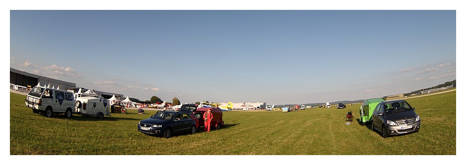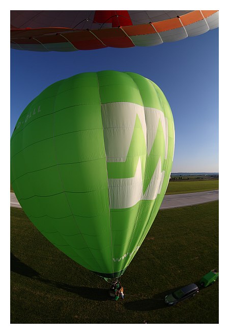 Zurück, zwischen den startbereiten Ballonen, bleiben unsere Verfolger mit Auto